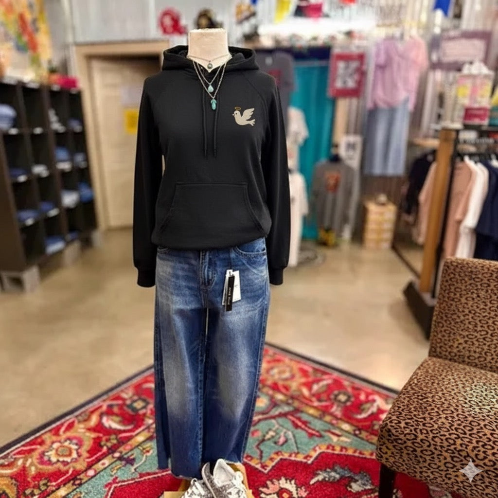Crafted from soft, durable cotton blend fabric, the hoodie features a colorful retro-style back print with a dove, halo, stars, and playful lettering that pops against the black backdrop. The message is clear: the Holy Ghost leads better than any horoscope ever could.